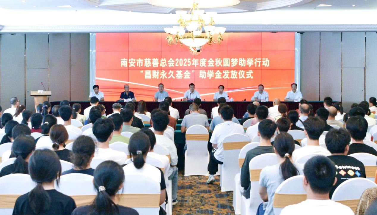 2025年8月,南安市慈善总会举行“昌财永久基金”助学金发放仪式,市长王连赞(主席台左四)讲话,会长侯昌财(主席台右三)等出席。